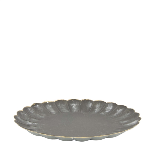 Elegante Metallplatte in dunklem Anthrazit mit dezentem Used-Look. Das ovale Design besticht durch einen wellenförmigen Rand, der an eine Blütenform erinnert.