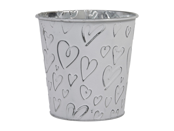 Runder Übertopf aus silberfarbenem Metall mit matter, weisser Aussenlackierung und eingeprägtem Herzmuster in verschiedenen Grössen.