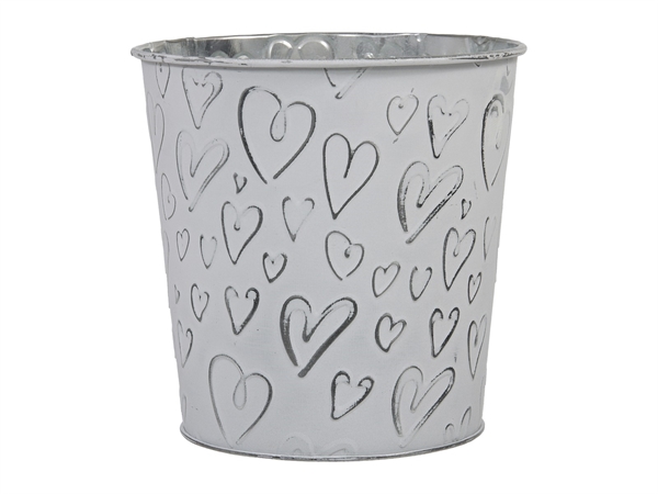 Runder Übertopf aus silberfarbenem Metall mit matter, weisser Aussenlackierung und eingeprägtem Herzmuster in verschiedenen Grössen.