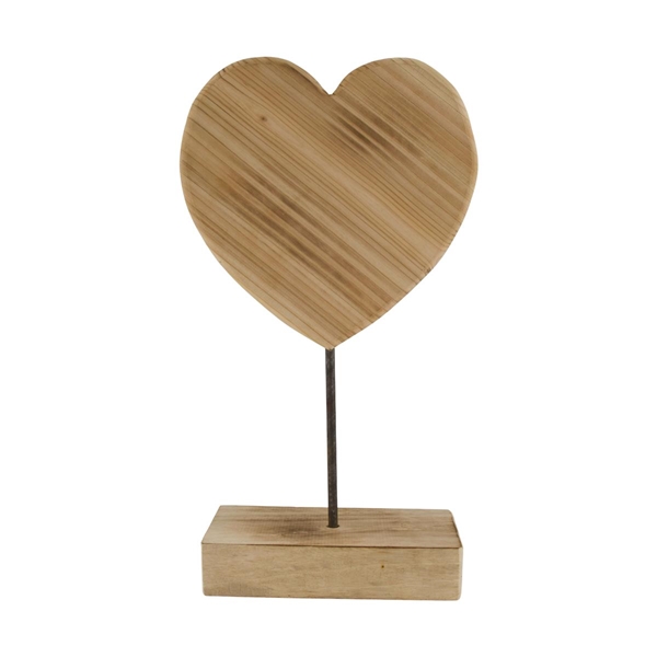 Coeur décoratif en bois naturel sur bâton en métal et socle en bois.